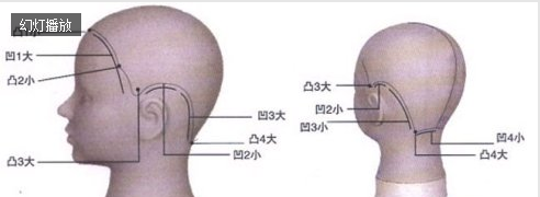 发际线条的形状个人差距的情形很明显.对于一般的理论在此进行解说。凸1的正中线附近有时会有小的突出部分(例如:美人尖)。甚至从正中线开始到鬓角的范围有大的凹陷情形(凹1)。因为这里有脸际线条的凹陷部位所以是复杂的点。凸2(脸际线条凹陷部位的突起部)因为是凹1的线上最接近脸部的点,虽然是小突起部.所以成为一个点。凸3(鬓角的的突起部位)因为呈现最大的突起情形.所以从前额和侧面部所连接的轮廓线条途中会发生有角落的情形。凹2是顺著耳朵呈现凹陷线条的情形。于进行侧面部的轮廓线条剪发时轮廓线条容易呈现凹陷的状态,这是因为这个凹2的凹陷情形殛这个位置下面的耳朵的高度关系所造成的原因。另外,因为耳后有凹3(从耳后开始连接到后头部尖角为止的大凹陷线条)的关系.所以会产生前后头发重叠的面积差距,前面的面积少时容易出现透过的情形。凸4是后头部尖角的突起部。以此处为顶点于后颈部的正中线侧描绘出凹陷的线条(凹4)。